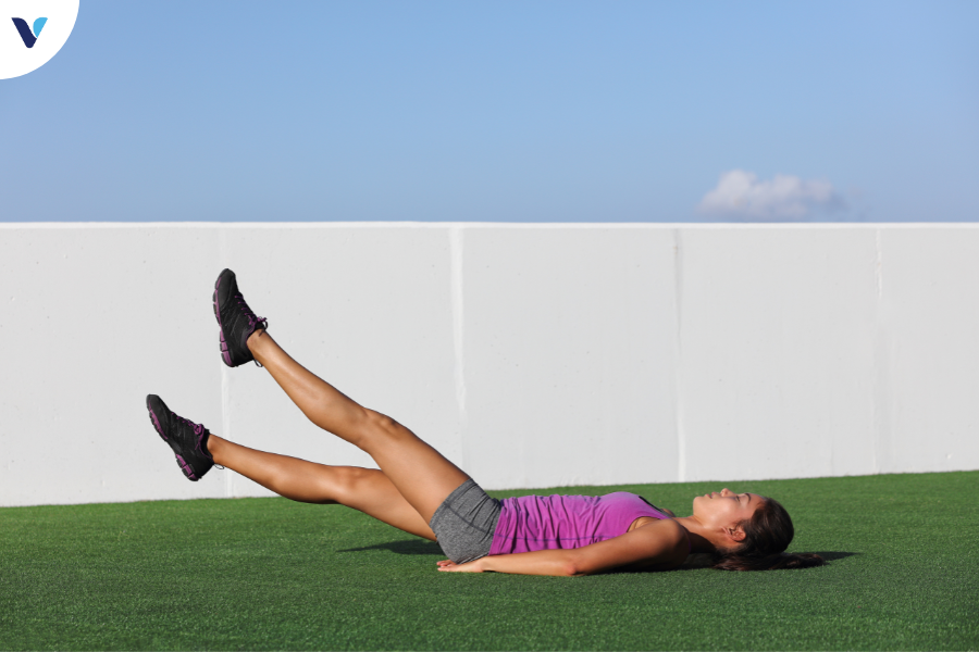 - Nâng cả hai chân lên thẳng đứng, sau đó từ từ hạ chân xuống nhưng không để chạm sàn.