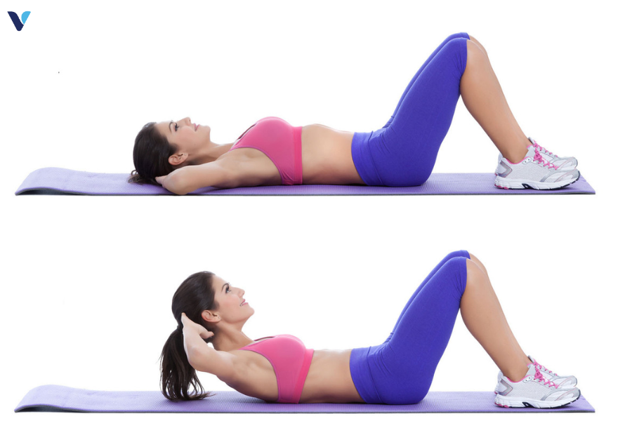- Nằm ngửa trên sàn, đầu gối co lại, hai tay đặt sau đầu.