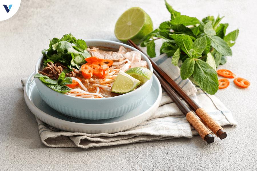 - Vitamin và khoáng chất: Vitamin B từ thịt bò/gà, vitamin C từ rau sống, canxi từ nước dùng xương.