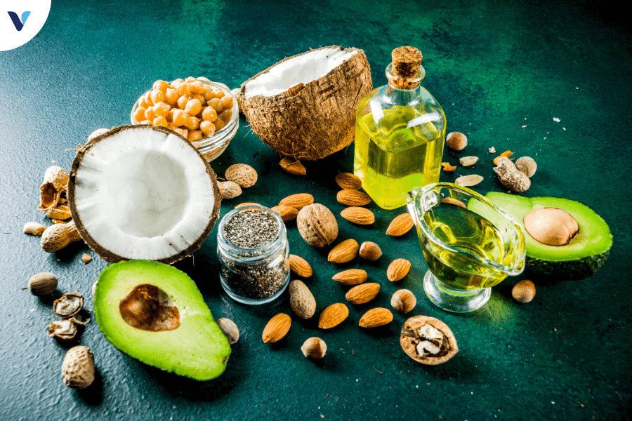 Chất béo lành mạnh giúp hấp thụ các vitamin tan trong chất béo như A, D, E, K, đồng thời cung cấp axit béo omega-3 giúp tóc mềm mại và bóng mượt. Bổ sung dầu ô liu, dầu cá, hạt chia, và các loại hạt khác vào chế độ ăn.