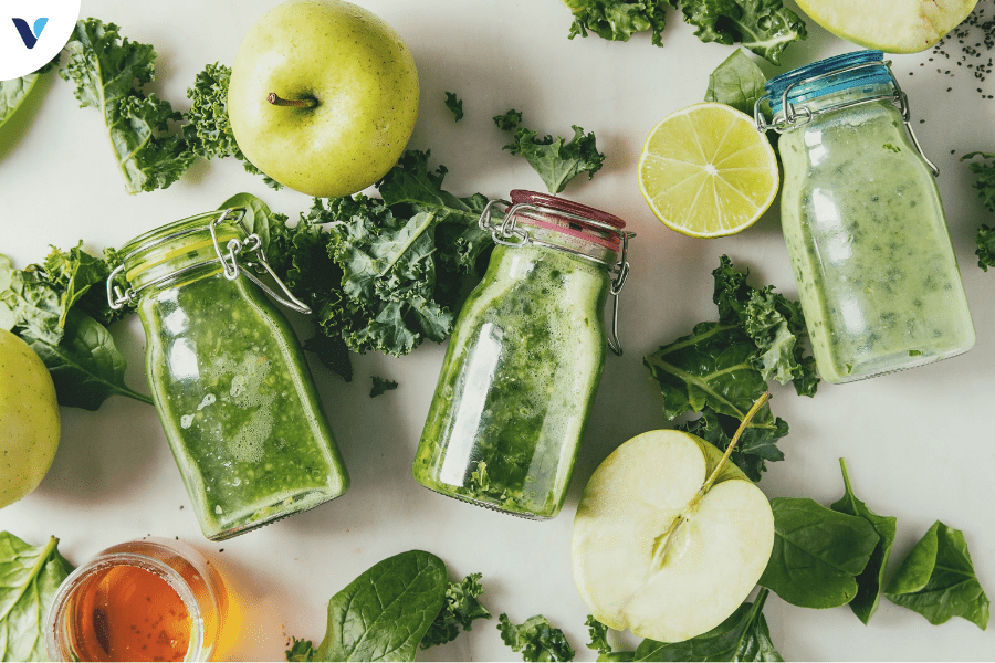 Sinh tố xanh làm từ các loại rau như cải bó xôi, cải kale, kết hợp với trái cây như chuối, táo, và một ít hạt chia hoặc hạt lanh là lựa chọn tuyệt vời cho bữa sáng. Sinh tố không chỉ dễ uống mà còn giúp cung cấp năng lượng và dinh dưỡng cho cả ngày dài.