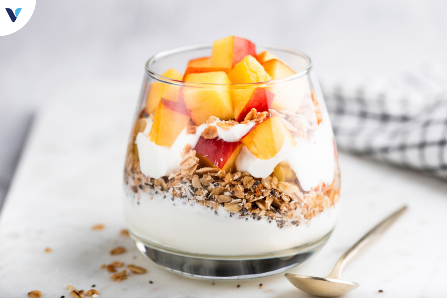 - Bữa Sáng: Sữa chua Hy Lạp không đường, hạt chia và một ít quả mâm xôi.