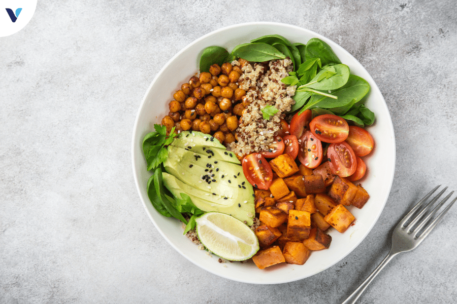 - Bữa trưa: Salad cá ngừ với rau lá xanh, cà chua, dưa chuột và vài lát bơ.