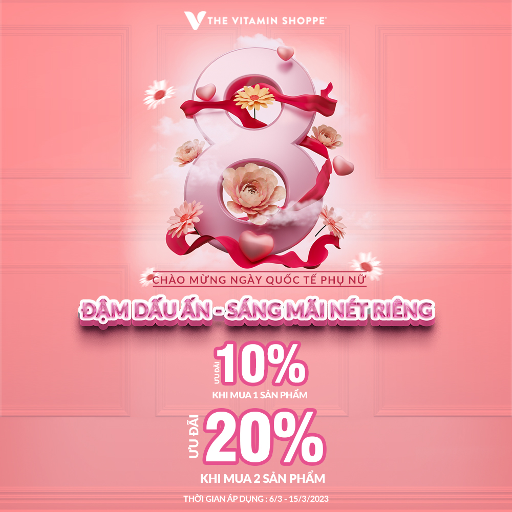 🎀 Chỉ cần bạn mãi tự tin yêu đời, quan tâm hơn đến bản thân mỗi ngày, thì mọi già đi của năm tháng sẽ bị xóa nhòa, và bản thân luôn tỏa sáng với nét đẹp của riêng mình. The Vitamin Shoppe hân hạnh được đồng hành cùng chăm sóc sức khỏe, sắc vóc để bạn luôn tự tin rạng rỡ cùng thời gian. Nhân ngày 8/3, The Vitamin Shoppe xin tới ưu đãi yêu thương đến một nửa thế giới. Từ 06/03-15/03: