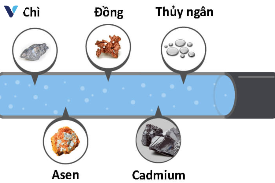 Kim loại nặng như chì, thủy ngân, asen và cadmium xâm nhập vào nguồn nước từ nước thải công nghiệp, khai thác mỏ hoặc phân bón hóa học. Những chất này cực kỳ nguy hiểm, đặc biệt với trẻ nhỏ và phụ nữ mang thai. Chì có thể làm giảm trí thông minh ở trẻ em và gây rối loạn thần kinh, trong khi thủy ngân ảnh hưởng đến hệ thần kinh trung ương và gây dị tật thai nhi. Asen, khi hấp thụ vào cơ thể qua nguồn nước, làm tăng nguy cơ ung thư da, phổi và các bệnh tim mạch, còn cadmium gây tổn hại lâu dài đến thận.