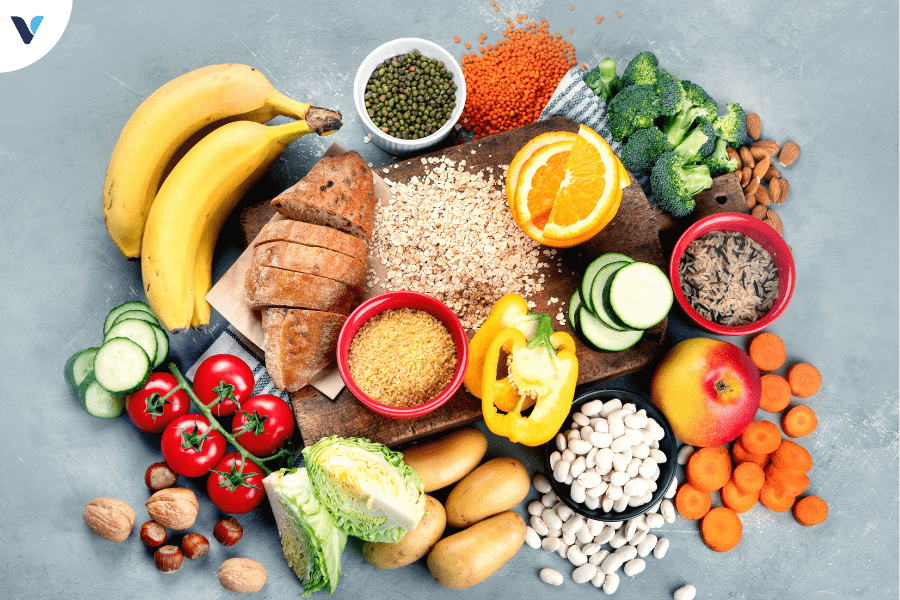 - Ngũ cốc nguyên hạt: Lúa mì nguyên hạt, yến mạch, gạo lứt, diên mạch, bánh mì nguyên cám, mì ống nguyên hạt