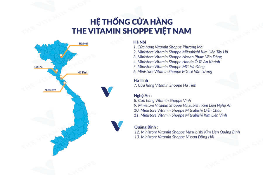 The Vitamin Shoppe có 1 cửa hàng theo tiêu chuẩn Hoa Kỳ, 2 Ministore tại TP Vinh và 1 Ministore tại Diễn Châu: