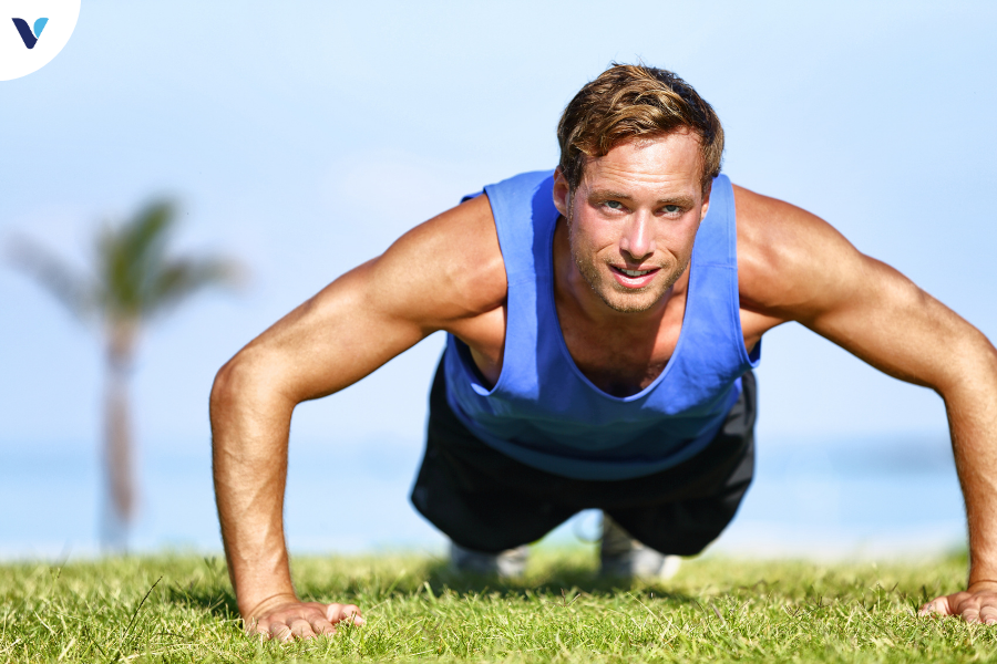 Lợi ích: Push-ups giúp tăng cường cơ bắp cánh tay, vai và ngực, đồng thời đốt cháy calo hiệu quả.