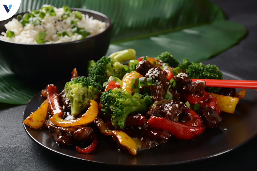 Bữa Tối: Bò xào rau củ (cải thìa, cà rốt, ớt chuông).