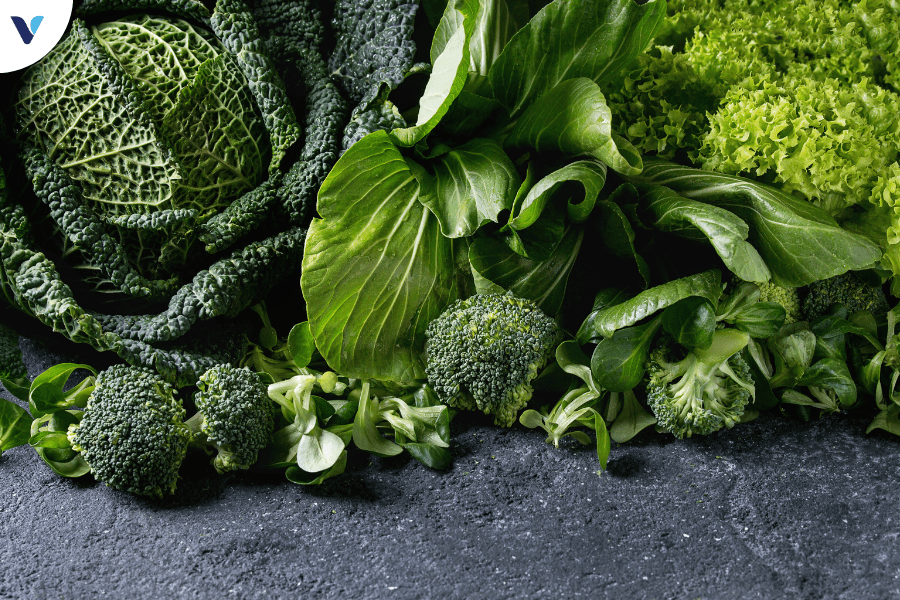 Rau xanh lá đậm như cải bó xôi, cải xoăn chứa nhiều vitamin, khoáng chất và chất xơ. Những loại rau này giàu sắt, cần thiết cho việc sản xuất hồng cầu và ngăn ngừa thiếu máu. Chất xơ giúp tiêu hóa tốt hơn và duy trì cân nặng lý tưởng. Ngoài ra, các loại rau xanh lá đậm còn chứa nhiều chất chống oxy hóa như vitamin C, vitamin E và beta-carotene, giúp bảo vệ tế bào khỏi sự tổn hại của các gốc tự do và tăng cường sức đề kháng.