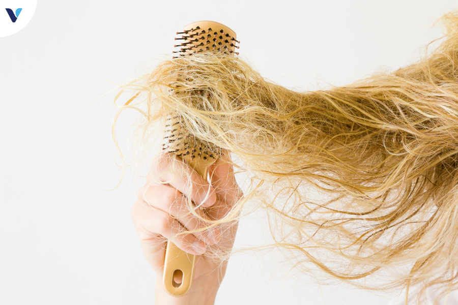 Chải tóc mạnh tay hoặc sử dụng lược không phù hợp có thể gây tổn thương cho tóc, khiến nó bị đứt gãy và rối. Rất nhiều người có thói quen chải đầu ngay sau khi gội xong, điều này có thể làm tóc khô xơ hơn. Khi tóc ẩm ướt, các sợi tóc trở nên mỏng manh và tóc rụng nhiều hơn bình thường. Do đó bạn nên dùng máy sấy ở chế độ làm mát hoặc đợi cho tóc gần khô hẳn rồi mới chải.