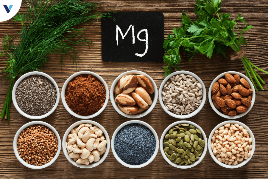Một số thực phẩm chứa magnesium: Hạt hạnh nhân, hạt óc chó, cá hồi và các loại hải sản, sữa và các sản phẩm từ sữa, rau xanh, đậu đen, đậu lăng, chuối...
