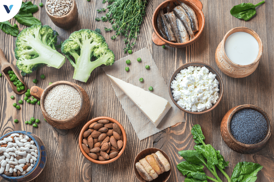 Các thực phẩm chứa canxi: Sữa và sản phẩm từ sữa, hải sản, quả óc chó, đậu phộng, rau xanh đậm,...