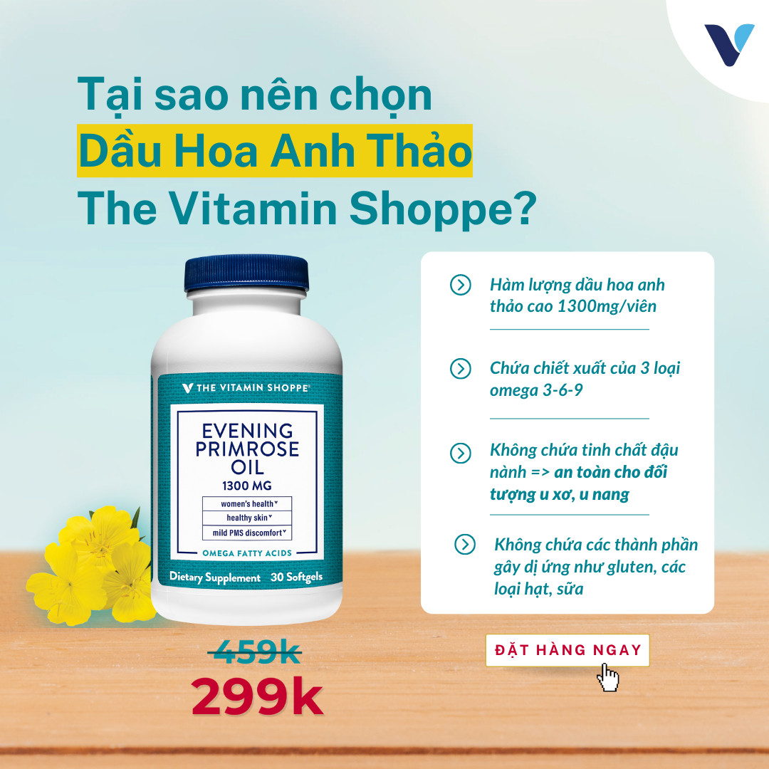 Sản phẩm Dầu Hoa Anh Thảo The Vitamin Shoppe với hàm lượng dầu hoa anh thảo cao 1300mg/viên chứa 3 loại axit béo có lợi LA , GLA , OA. Trong đó, Gamma-Linolenic Acid (GLA) có trong dầu hoa anh thảo là loại acid béo thiết yếu mà cơ thể không tự tổng hợp được, buộc phải bổ sung bên ngoài, có tác dụng cân bằng các hormon sinh sản của phụ nữ, giúp duy trì và điều hoà nội tiết tố nữ. Nhờ vậy mà sản phẩm này có thể giúp bạn chấm dứt những bệnh lý do sự rối loạn và mất cân bằng nội tiết gây ra, đặc biệt là mụn nội tiết. Với mụn nội tiết, cách tốt nhất để làm cho mụn ngừng lên và không viêm sưng nữa đó là xử lý tận gốc nguyên nhân bên trong (nội tiết) thay vì sử dụng các loại mỹ phẩm bôi bên ngoài.