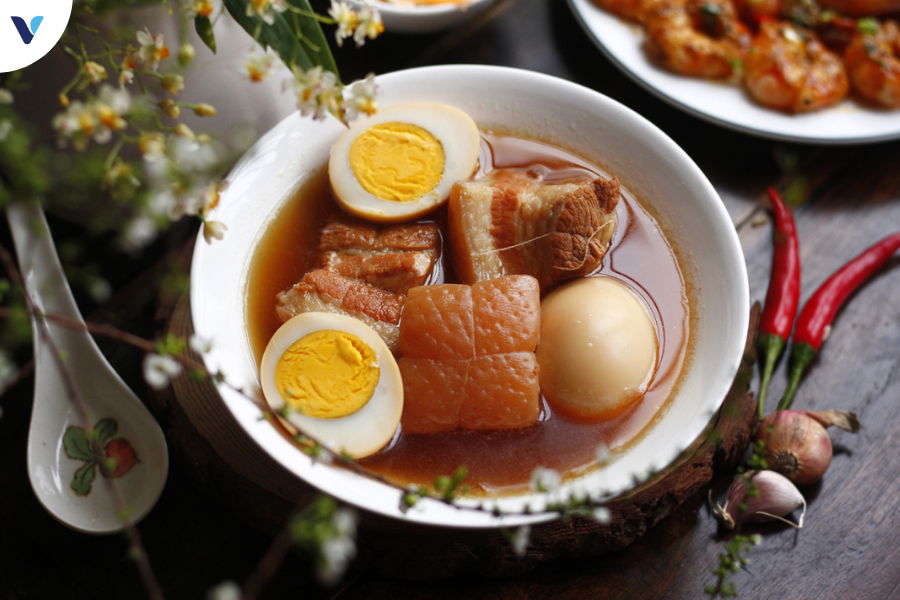 Thịt kho, đặc biệt là thịt kho tàu với hột vịt, là một món ăn giàu năng lượng do có chứa thịt ba chỉ và trứng vịt, được kho trong nước dừa và nước mắm. Một phần thịt kho (khoảng 100g) có thể chứa khoảng 300-350 calo, tùy thuộc vào lượng mỡ trong thịt và cách chế biến. Nếu thêm trứng vịt, lượng calo có thể tăng thêm khoảng 70-90 calo cho mỗi quả trứng.