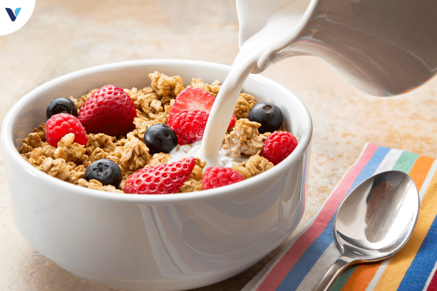 Ngũ cốc cung cấp carbohydrate, protein từ sữa và nhiều vitamin, khoáng chất. Lựa chọn ít đường và giàu chất xơ sẽ lành mạnh hơn.