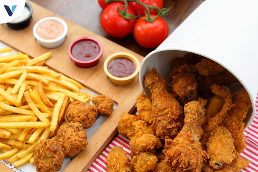 - Các món chiên, xào, đồ ăn nhanh như gà rán, khoai tây chiên, hoặc pizza chứa nhiều chất béo bão hòa. Chúng khiến hệ tiêu hóa phải làm việc vất vả hơn, dẫn đến cảm giác nặng bụng và khó ngủ.