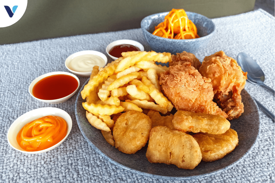- Thực phẩm chiên rán và đồ ăn nhanh: Những món ăn này chứa nhiều chất béo xấu, làm chậm quá trình tiêu hóa và gây áp lực lên dạ dày.