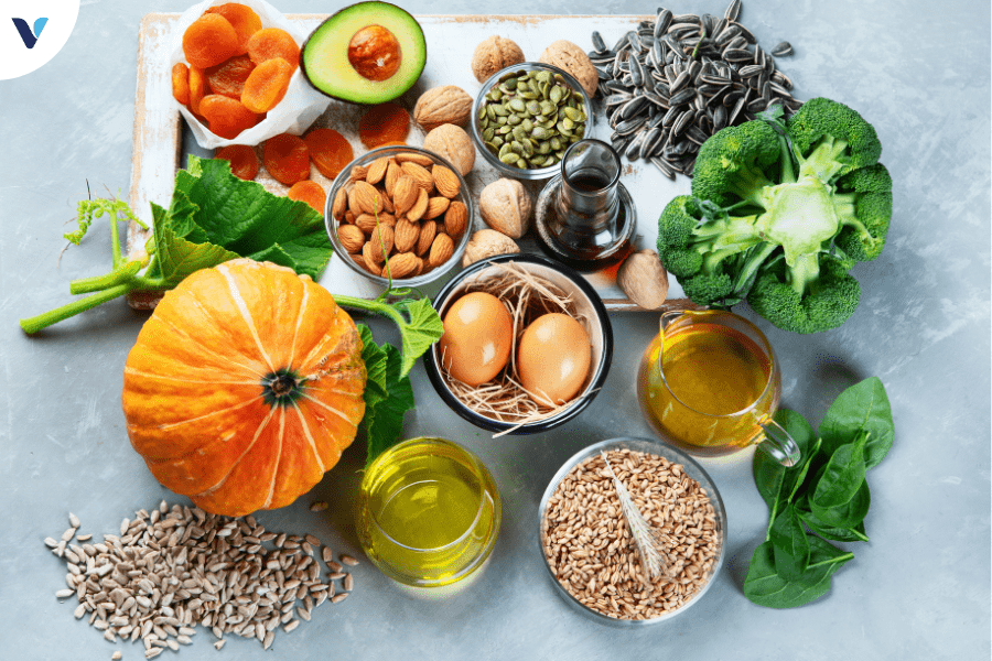 Là một trong các vitamin được phái đẹp cực ưa chuộng, bạn có thể bổ sung vitamin E thông qua hạt hướng dương, hạnh nhân, đậu phộng hay các loại rau như bông cải xanh, cà chua, rau bina,... Tuy nhiên, cần lưu ý vitamin E tan trong dầu, và được tích lũy trong cơ thể. Do đó, khi bổ sung cần lưu ý liều lượng để tránh hiện tượng dư thừa gây độc. (Liều lượng với đối tượng >19 tuổi: Không quá 1000mg/ngày).